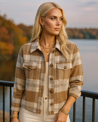 Elevate your casual wardrobe with our Tan Plaid Shacket, featuring a classic collar, front pockets and button-down front for effortless layering. The grey accent combination adds a sophisticated touch while an option for rolled sleeves create a chic, relaxed vibe. Pair it seamlessly with creme pants or denim and basic tees or tanks for versatile styling. The fit is true to size. Wear it everyday, on weekend getaways, and day at the mountain or at that fabulous resort. Sophisticated styling at its best.