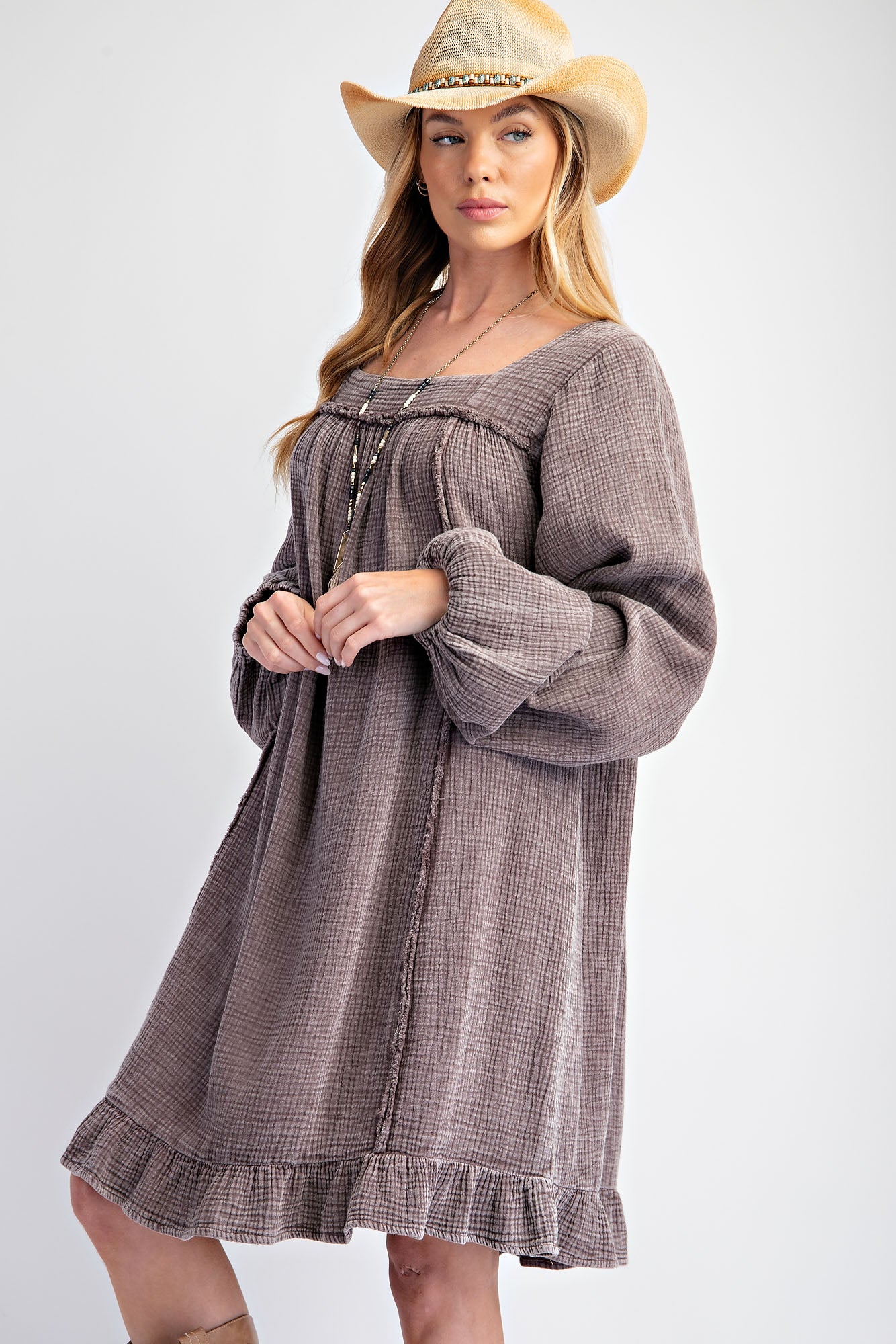 This beautiful ash-colored dress is the perfect blend of comfort and style. With a flowy textured fabric and long balloon-style sleeves, it's both lightweight and flattering, making it an easy choice for any occasion. Its square neckline adds an chic flair, while the bottom ruffle creates a unique and eye-catching detail. The perfect dress to travel with.